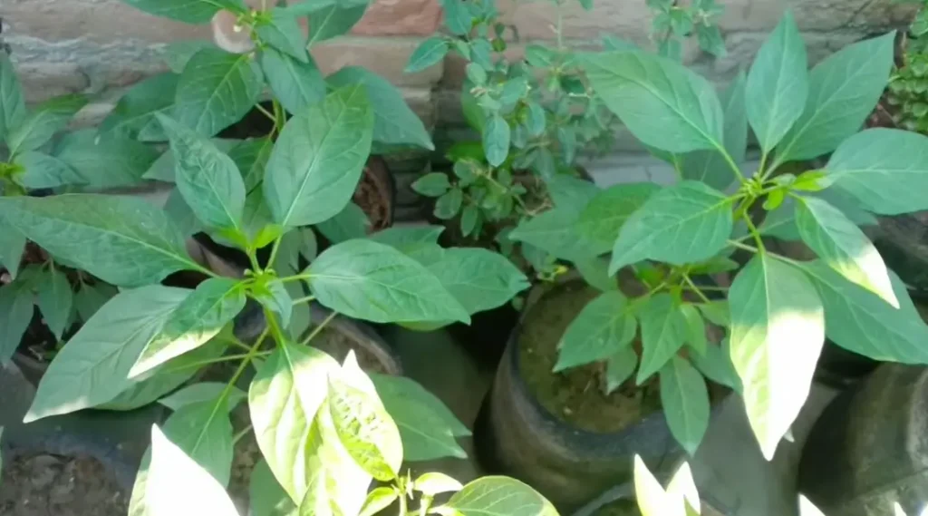 One of the first summer vegetables you can still grow is the chili plant. As shown, the plants are lush green, and some have already started producing chilies. These plants were grown from seeds at home, and fruiting has begun. Some plants ordered online have also started producing fruits. One variety has fruits that grow upward toward the sky. This variety grows very fast, and its chilies are quite strong in taste.