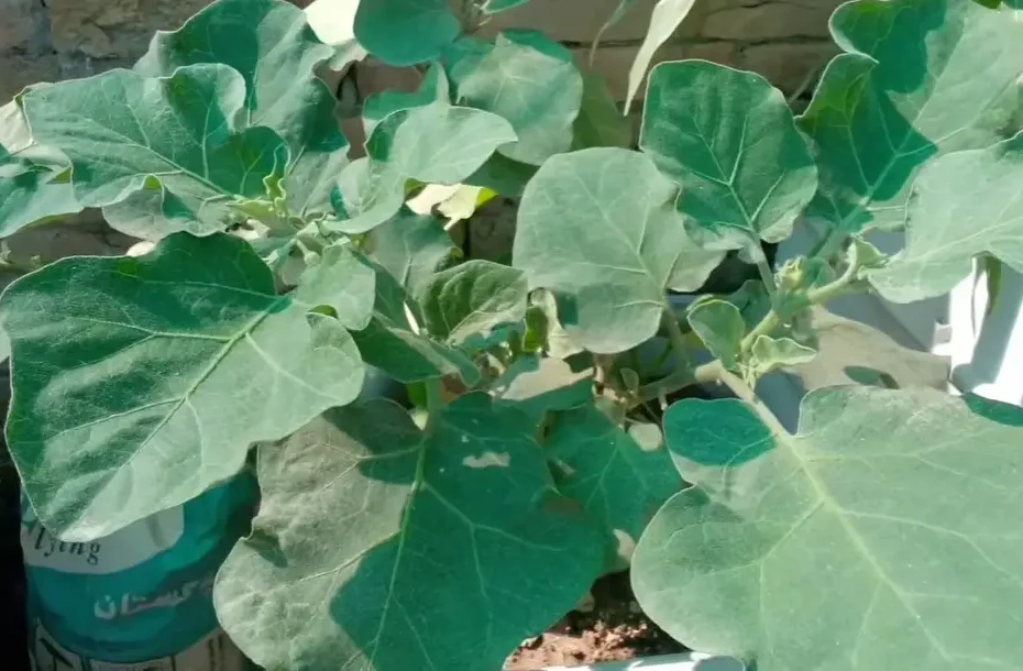 Eggplant is a vegetable found worldwide and grows in almost every climate. It is a very hardy plant that can grow in poor soil and requires minimal care while giving high yield. The plant shown is already producing fruits, and new flowers are appearing in clusters on different branches.